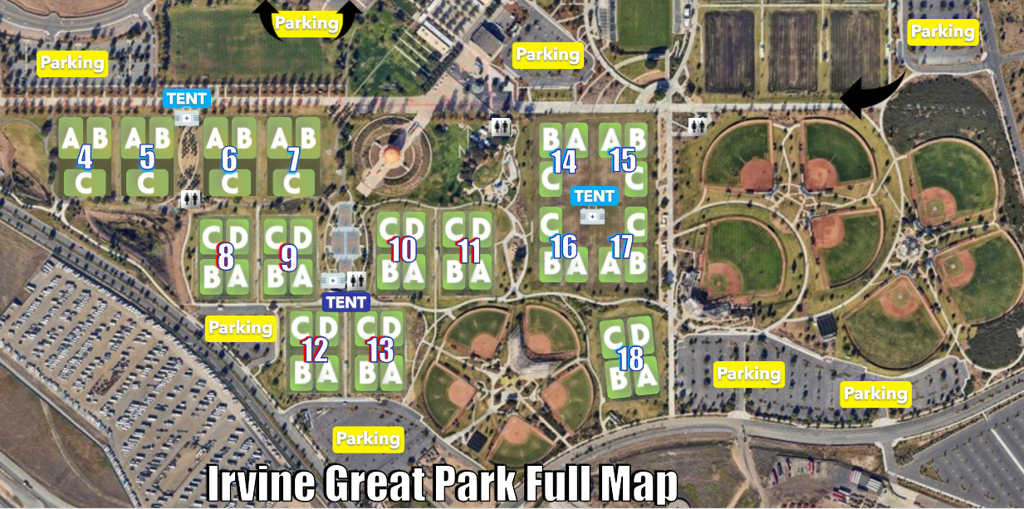 Teams playing games on fields 8-13 should park in Lot 6 or Lot 7. We suggest parking in Lot 6, as it is the biggest lot available. You can access Lot 6 two ways. If entering Great Park on Marine Way make a U turn at Skyhawk, then a right into Lot 6.